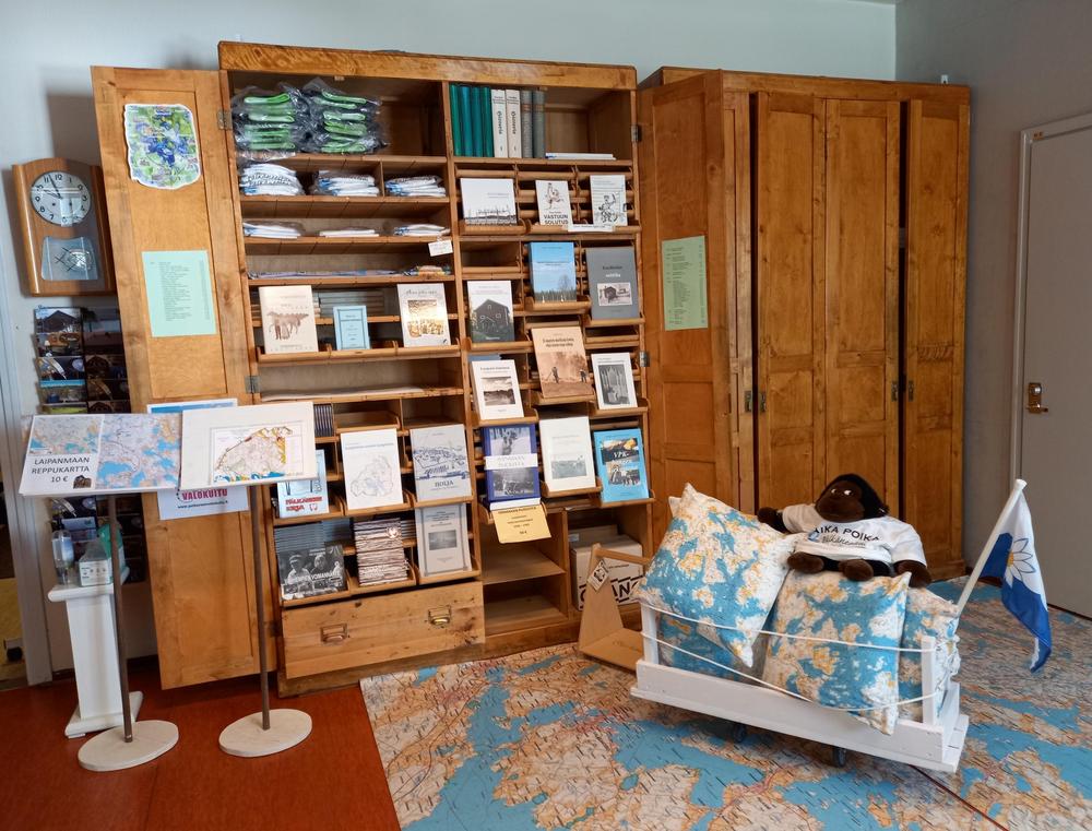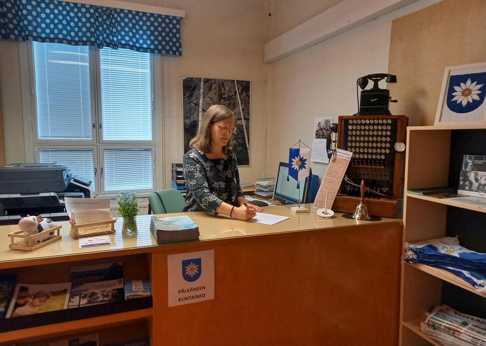 Kuntainfossa sinua palvelee Riitta Mukkulainen. Palvelupisteessä on myynnissä karttoja, kirjoja, kortteja, Kukkia-aiheisia tuotteita ym.