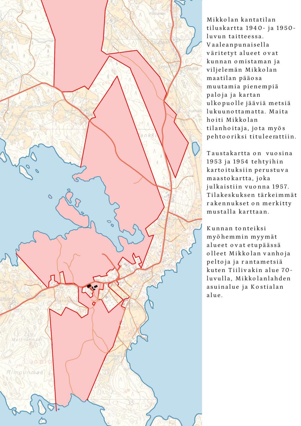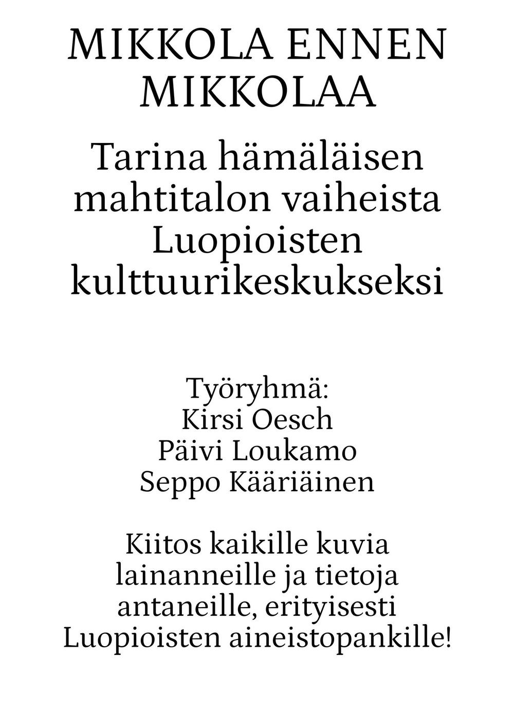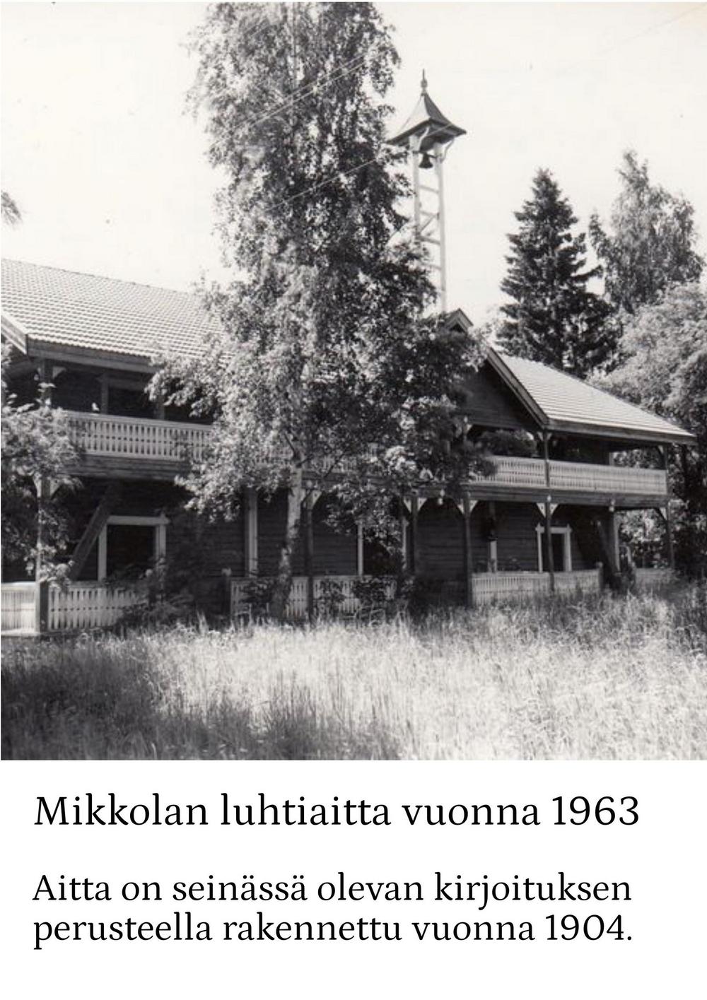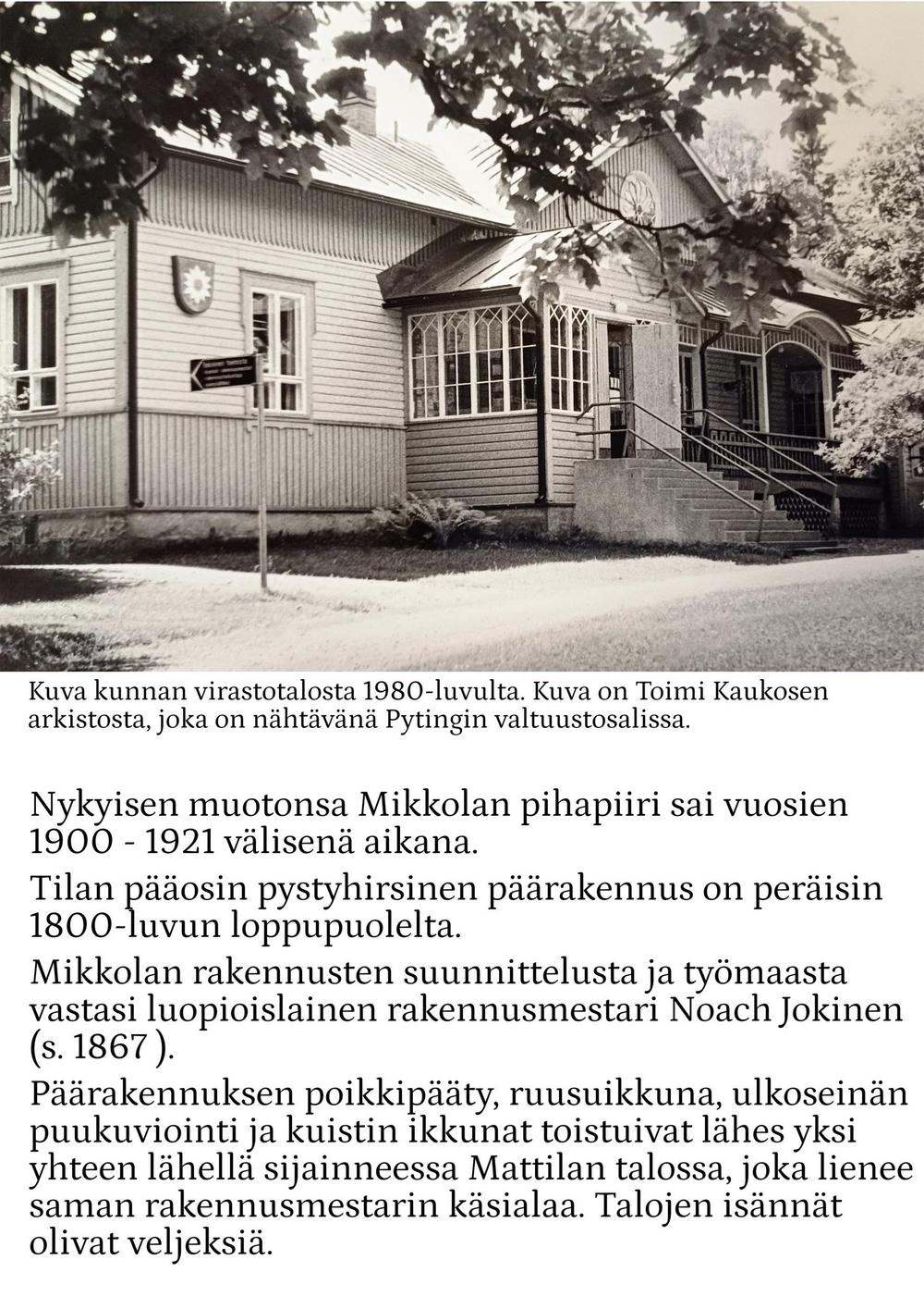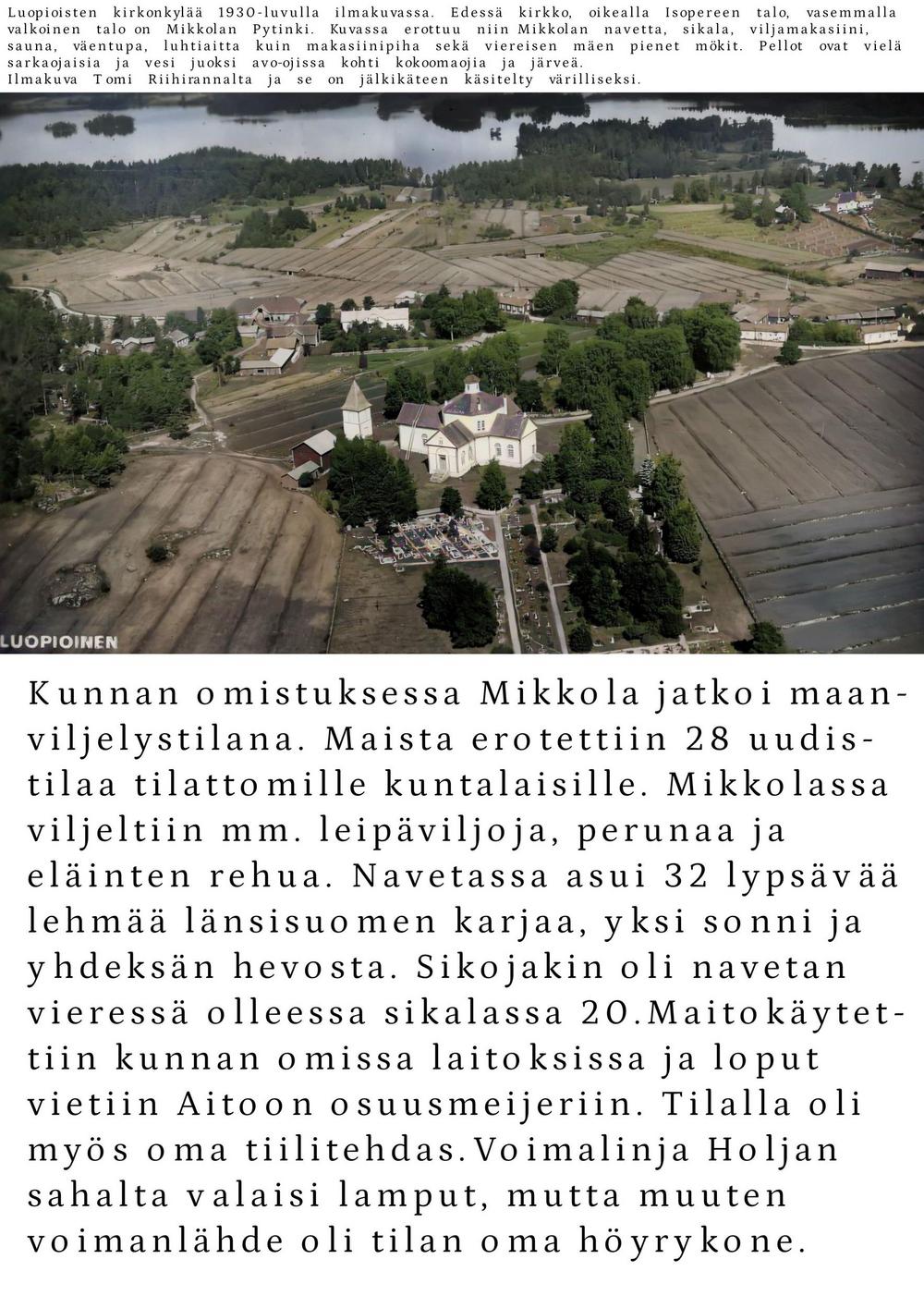 Vuonna 1922 tila myytiin Luopioisten kunnalle. Kunnan omistuksessa Mikkola jatkoi maanviljelystilana. Siellä viljeltiin ruista, kauraa, ohraa, perunaa, pellavaa, rehujuurikasveja, heinää ja vihantarehua ja pidettiin lypsykarjaa. Olipa Mikkolassa oma tiilitehdaskin. Mikkolan tilan nykyinen pääosin pystyhirsinen päärakennus on rakennettu 1800-luvun loppupuolella. Puurakentamisen nikkarityyliset ihanteet saivat näin Luopioisissa paikallisen talonpoikaisen tulkinnan. Päärakennuksen pohjoispuolella maantien varrella sijaitsee vuonna 1915 rakennettu tiilinen jyvämakasiini. Mikkolan päärakennus toimi kunnanlääkärin virka-asuntoja ja vastaanottotiloina vuodesta 1922 vuoteen 1955. Lisäksi rakennuksessa sijaitsivat myös kirjastotilat.
