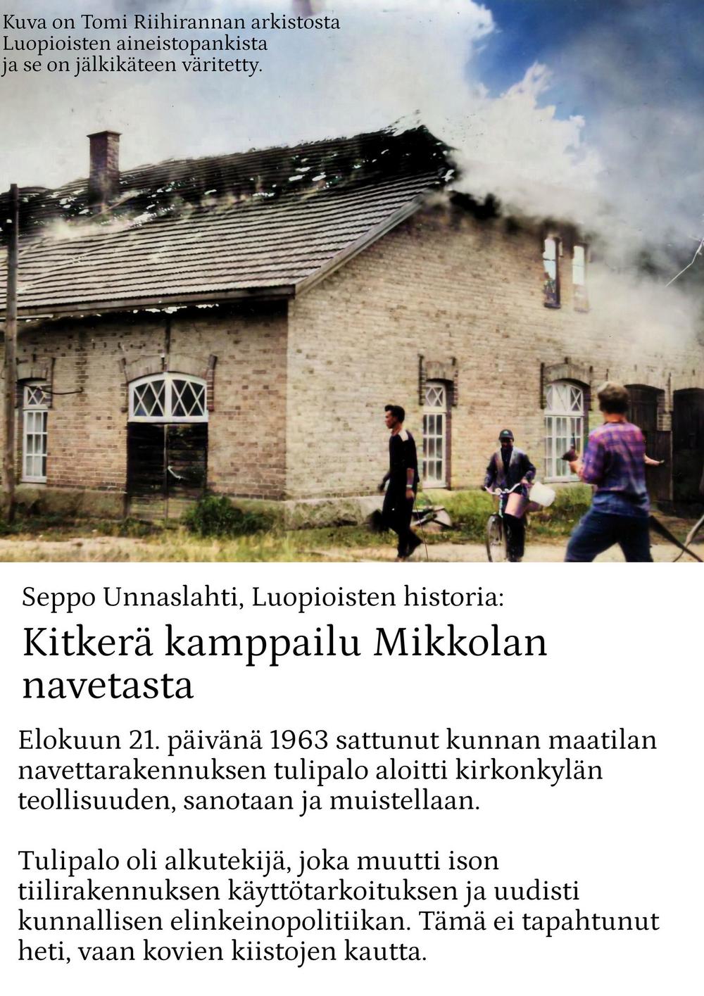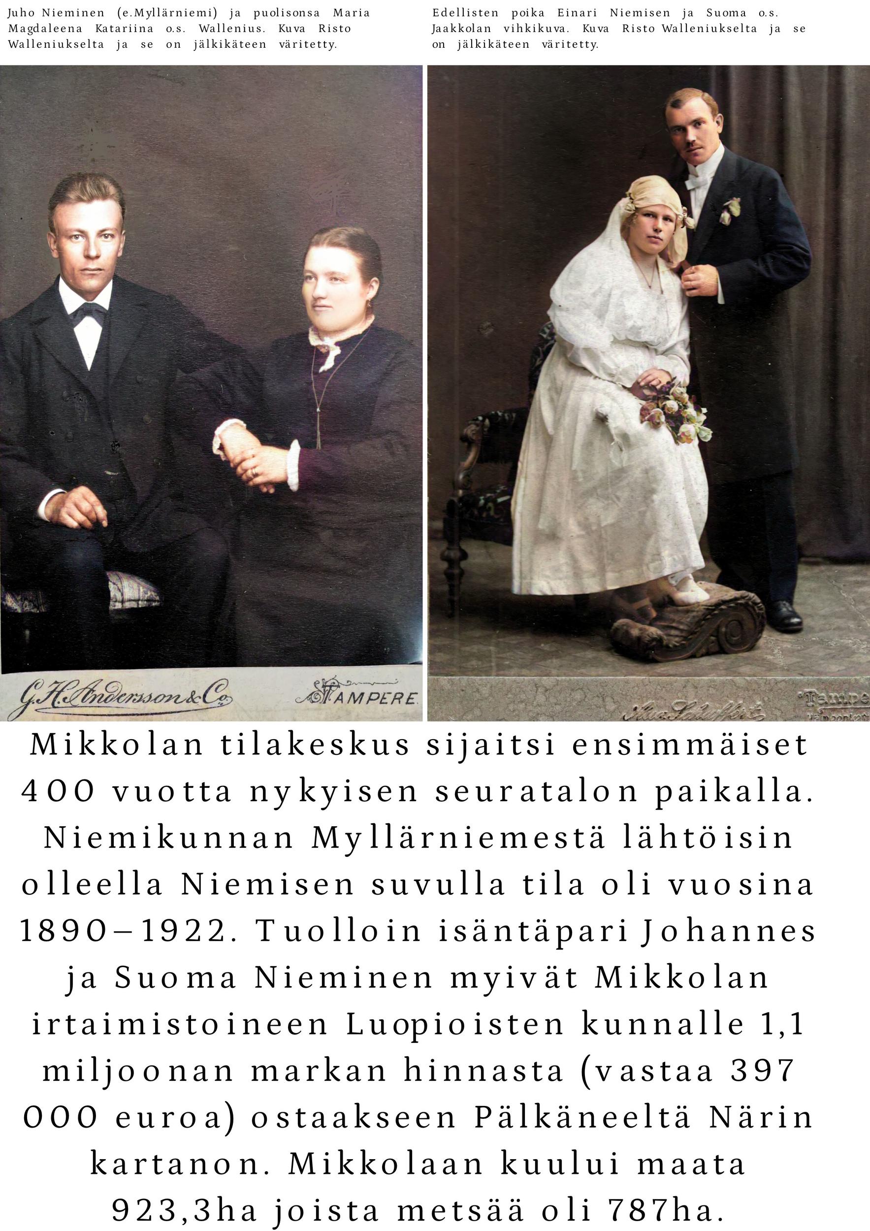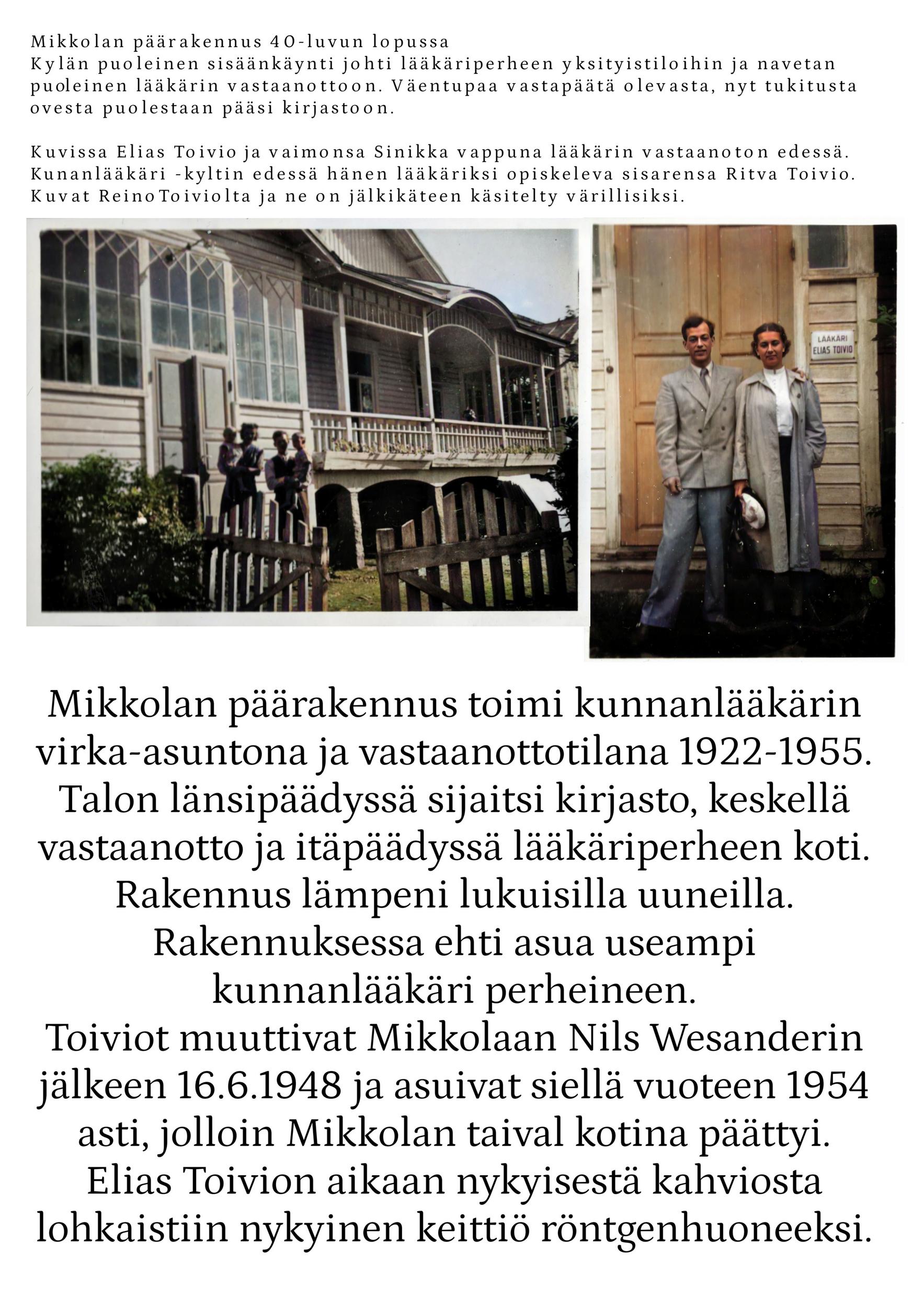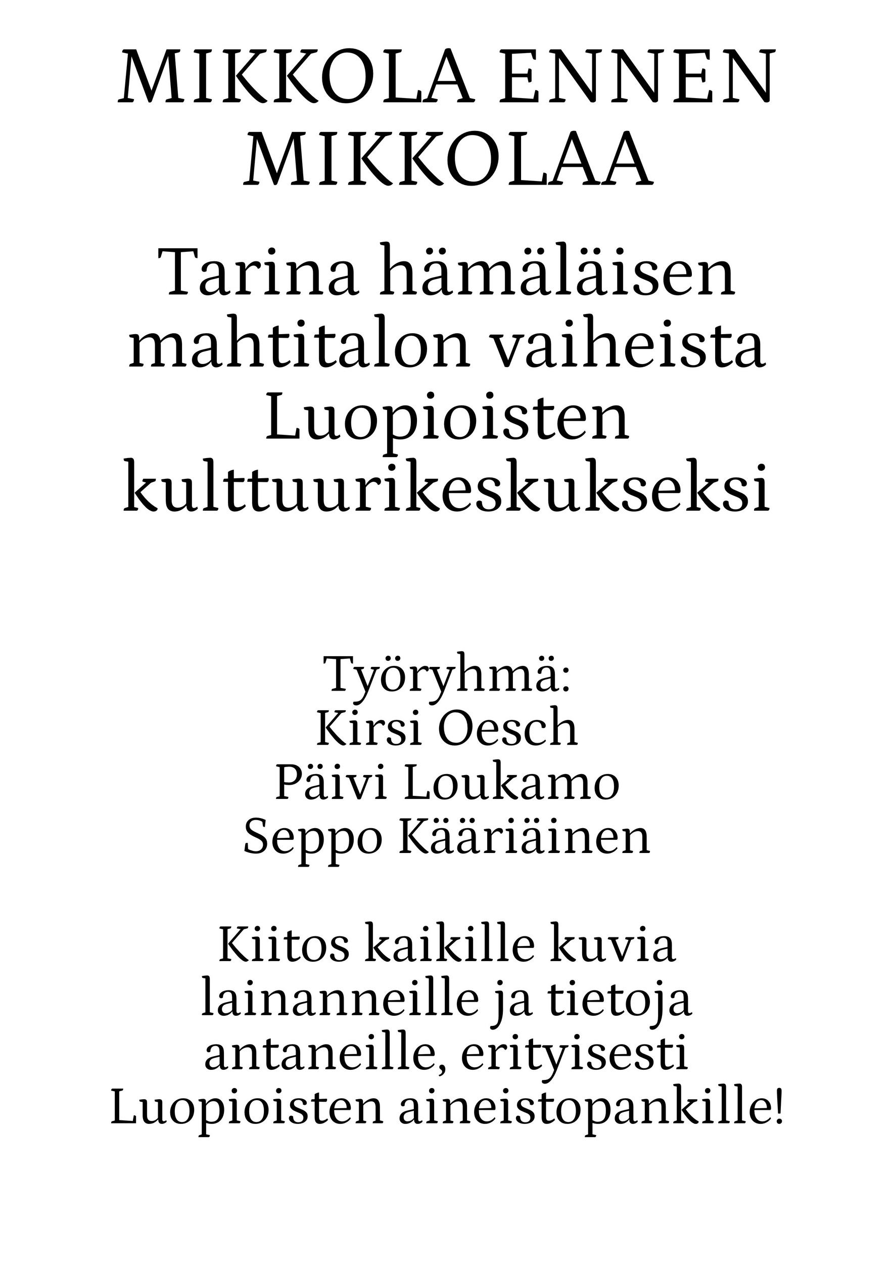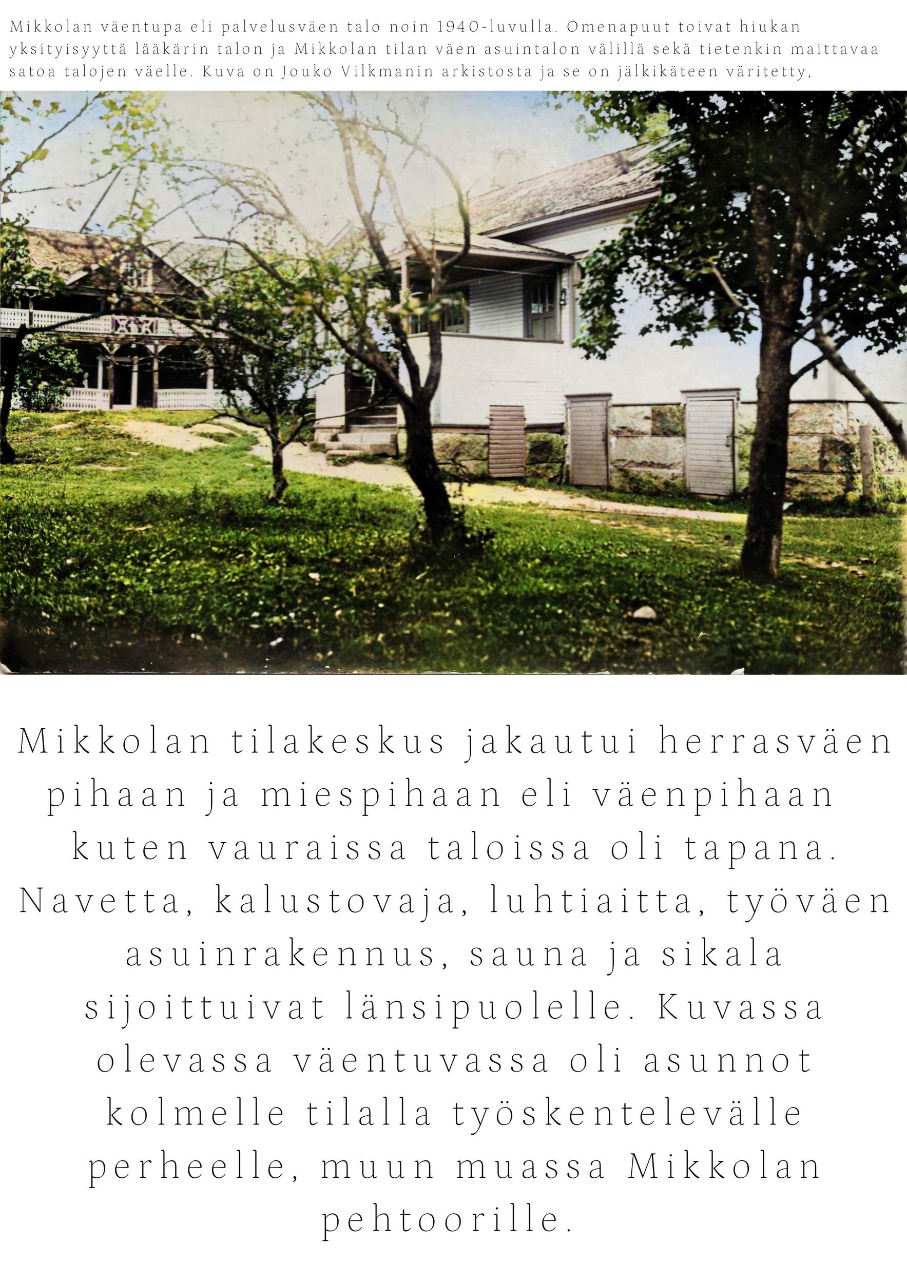 Vuonna 1922 tila myytiin Luopioisten kunnalle. Kunnan omistuksessa Mikkola jatkoi maanviljelystilana. Siellä viljeltiin ruista, kauraa, ohraa, perunaa, pellavaa, rehujuurikasveja, heinää ja vihantarehua ja pidettiin lypsykarjaa. Olipa Mikkolassa oma tiilitehdaskin. Mikkolan tilan nykyinen pääosin pystyhirsinen päärakennus on rakennettu 1800-luvun loppupuolella. Puurakentamisen nikkarityyliset ihanteet saivat näin Luopioisissa paikallisen talonpoikaisen tulkinnan. Päärakennuksen pohjoispuolella maantien varrella sijaitsee vuonna 1915 rakennettu tiilinen jyvämakasiini. Mikkolan päärakennus toimi kunnanlääkärin virka-asuntoja ja vastaanottotiloina vuodesta 1922 vuoteen 1955. Lisäksi rakennuksessa sijaitsivat myös kirjastotilat.