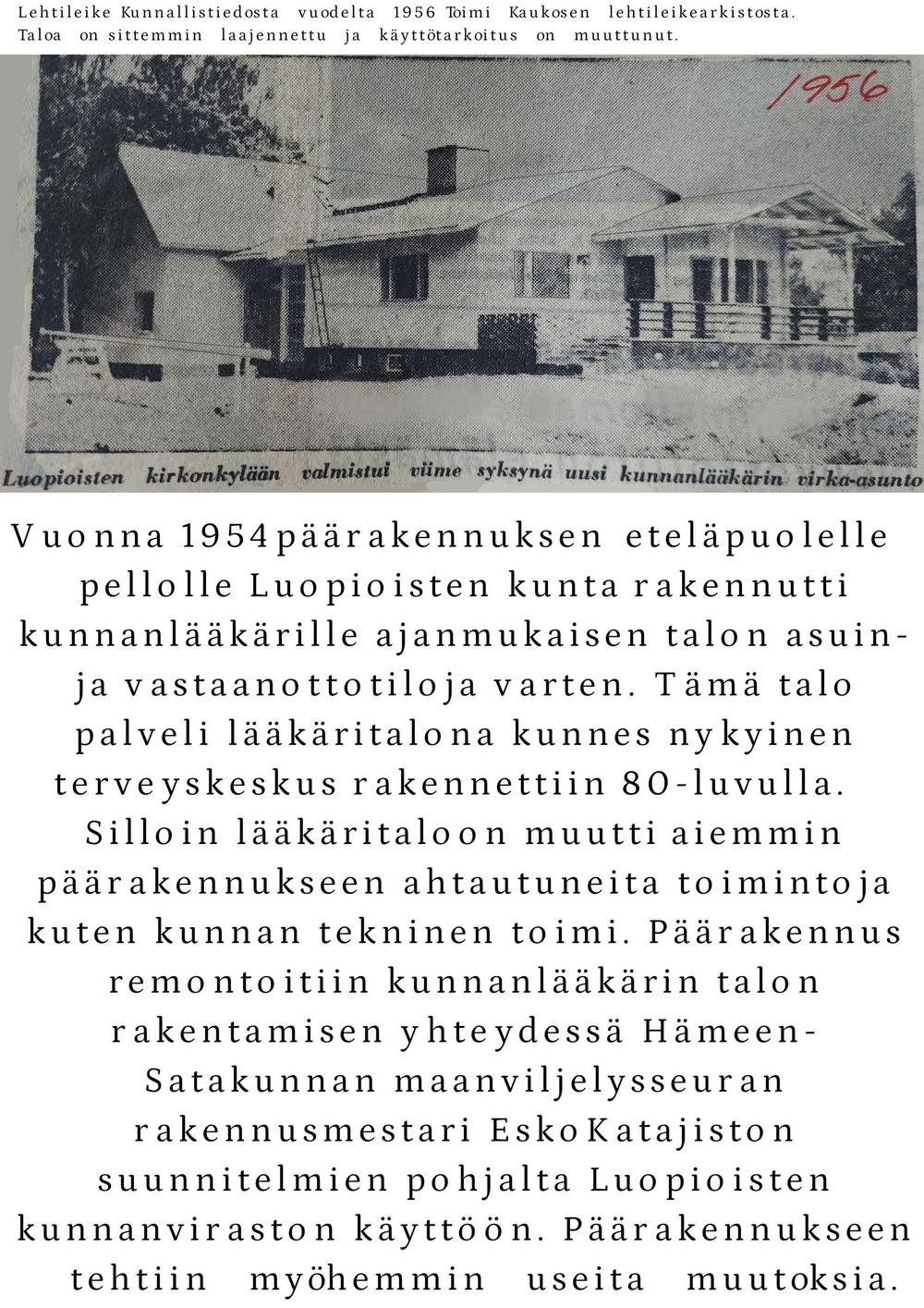 Muutostöiden valmistumisen jälkeen uusittuihin tiloihin muutti Luopioisten kunnanvirasto. Rakennukset ja pihapiiri edustavat vaurasta hämäläistä talonpoikaista rakennusperintöä ja rakennusryhmä on osa ympäristöministeriön vahvistamaa valtakunnallisesti merkittävää Luopioisten kirkonkylän kulttuurihistoriallista ja vanhaa raittiasutusta. Rakennus ja pihapiirikokonaisuus on luokiteltu myös Tampereen seutukaavaliiton 1990 inventoinnissa sekä rakennushistoriallisesti että miljööarvoltaan maakunnallisesti merkittäväksi kohteeksi.